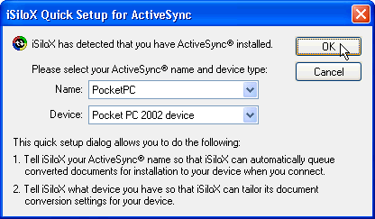 start iSiloX, you get the Quick Setup for ActiveSync® dialog