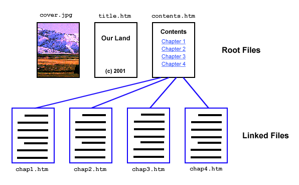 In the diagram, the assumption is that the files "cover.jpg", "title.htm", and "contents.htm" have been specified as the source files of the document and that the document's properties specify that links should be followed. Assuming that the "contents.htm" file has hyperlinks to the four files "chap1.htm", "chap2.htm", "chap3.htm", and "chap4.htm", when you convert the document, all seven files will be brought in to create the final iSilo™ document with seven pages, one for each file.